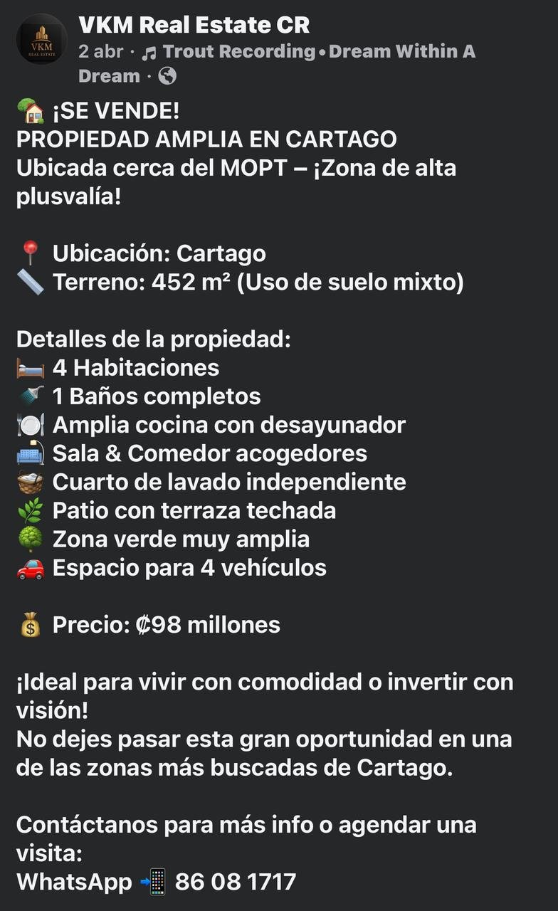 Property in Cartago, 452 m² with residential and commercial land use. 4 bedrooms, 1 bathroom, large green area, and parking for 4 vehicles.